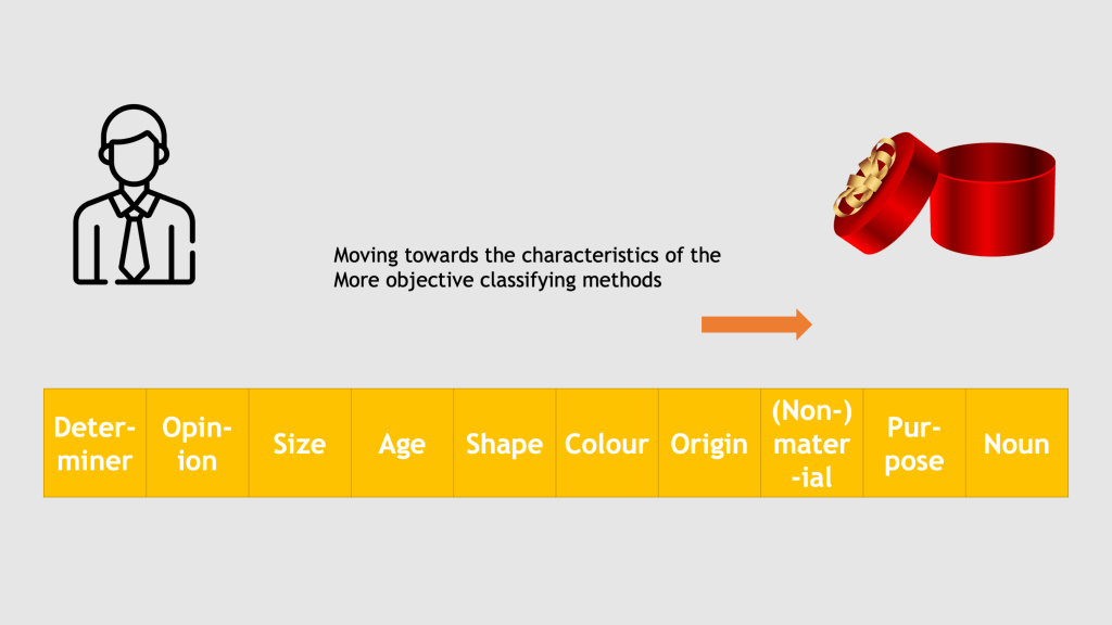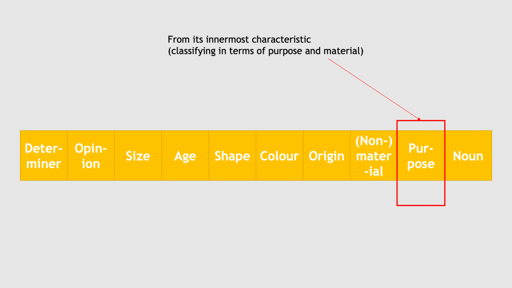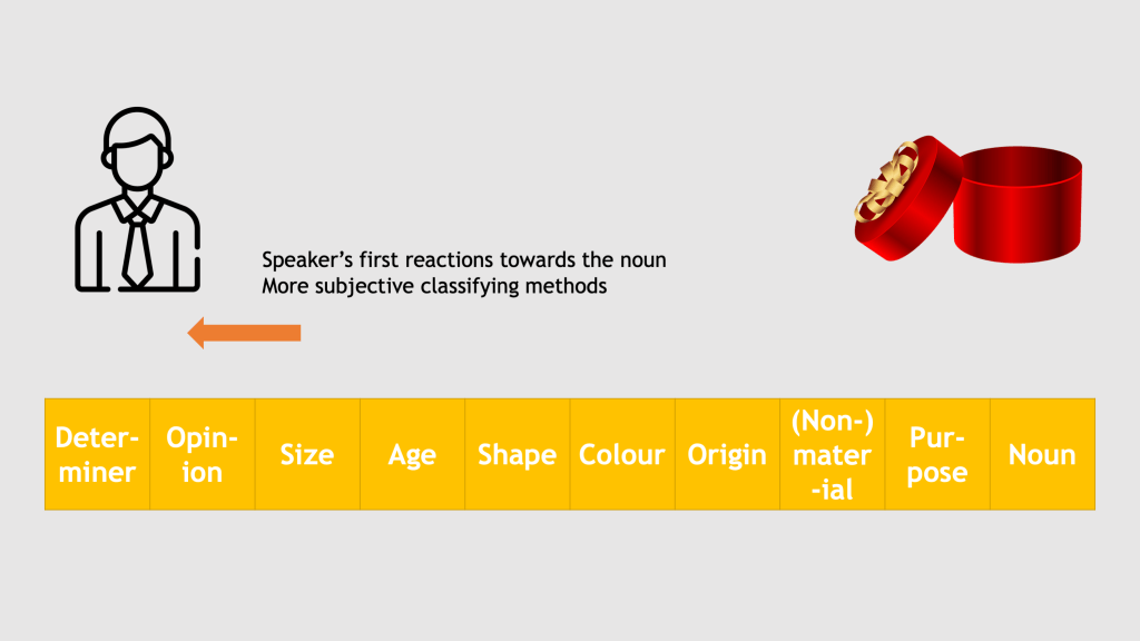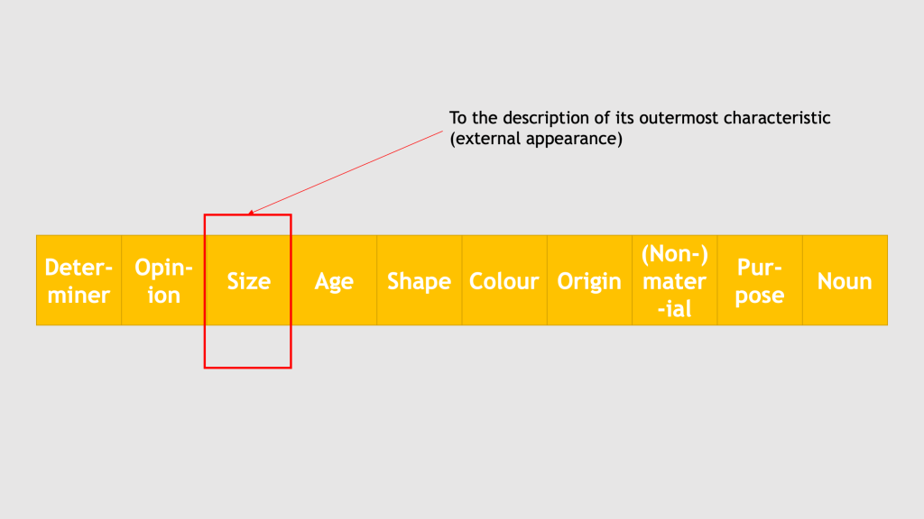 That means, storage would directly classify box in terms of its intrinsic function (storage box, lunch box, mail box), and then porcelain denotes the material, and so on. Then, the adjective moves from the box’s colour (on the object’s surface), shape, age to size (zooming out to more outward qualities). This seems to create an effect that each description moves towards to the observer, so that it is easier for him/her to identify.