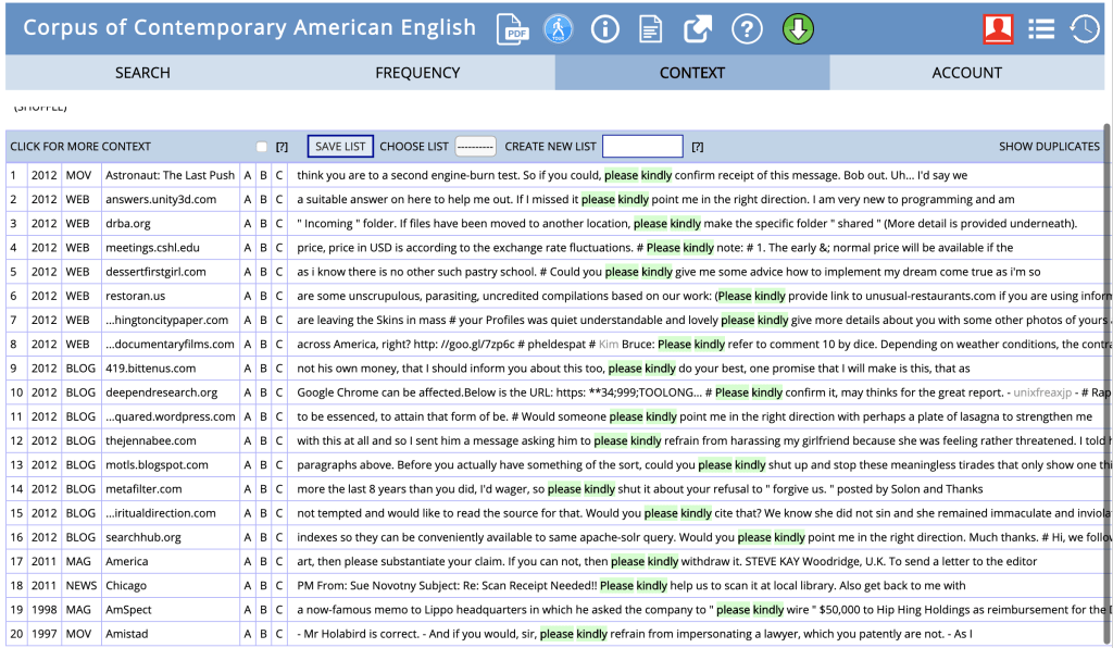 不過,從實據看,please kindly 不是不存在的。語料庫(corpus, 即文字資源庫) 告訴我們,它們只是不在正式文書中出現。我用上《當代美語語料庫》(Corpus of Contemporary American English) 搜尋 please kindly,發現有20 條結果: