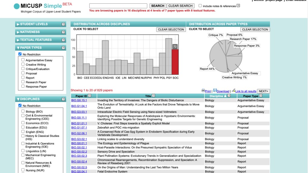 MICUSP is a 8-million word corpus of A-grade papers from 16 disciplines across 4 tertiary levels of native and non-native English speaking students. It has a simple, straightforward interface, with all the functionalities that can look very daunting to students who don’t want to be linguistic detectives.